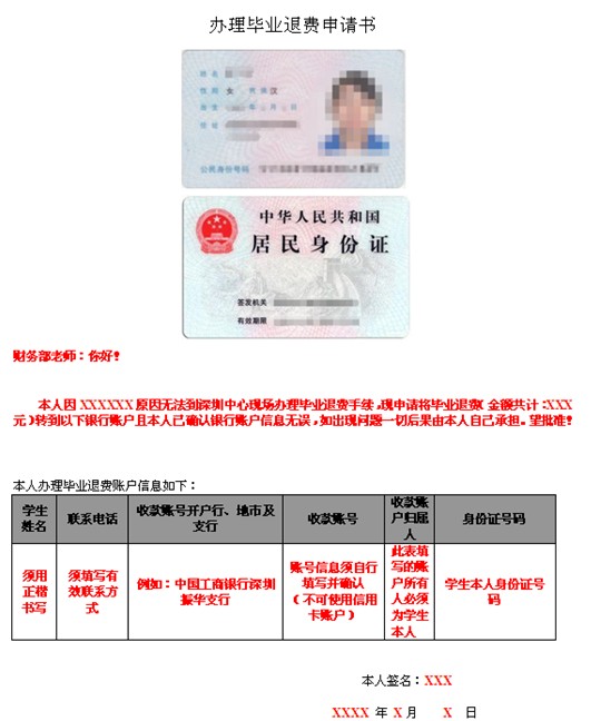 5、代領(lǐng)需由代領(lǐng)人簽名、簽領(lǐng)取年、月、日,同時(shí)填寫(xiě)“畢業(yè)退費(fèi)申請(qǐng)書(shū)”交給財(cái)務(wù)辦理銀行轉(zhuǎn)賬。