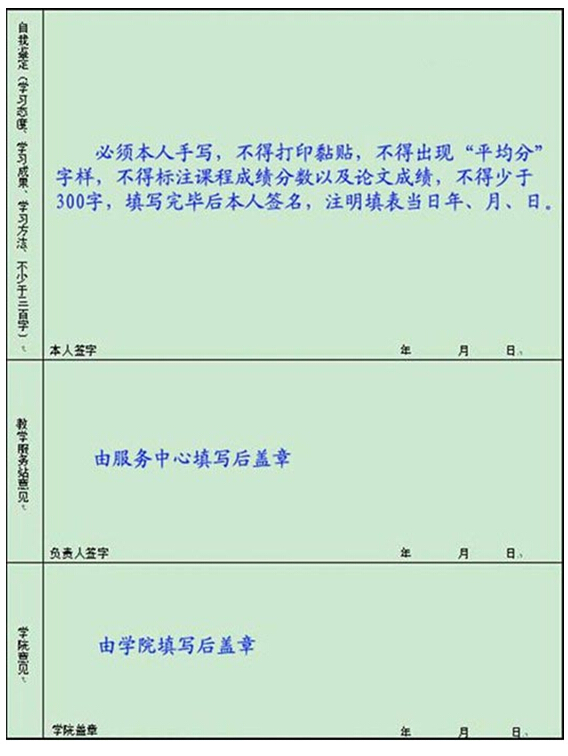 二、請提前撰寫好字?jǐn)?shù)不少于300字的的“個人鑒定”,根據(jù)在學(xué)院學(xué)習(xí)期間的態(tài)度、成果、方法等方面來總結(jié)。個人鑒定必須手寫,不能粘貼打印稿;