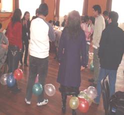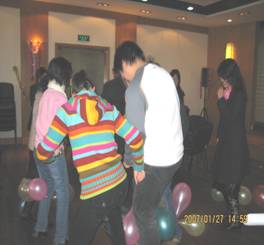 參加活動的學(xué)生分別為管理一班、管理二班、經(jīng)濟(jì)學(xué)一班和文學(xué)、法學(xué)和非學(xué)歷班?;顒右婚_始,首先就是玩踩氣球,只見每個班派了 2 名同學(xué)參與,共計 8 名,每名學(xué)生腳上綁三個氣球。游戲到最后,看誰腳上氣球最多為優(yōu)勝。