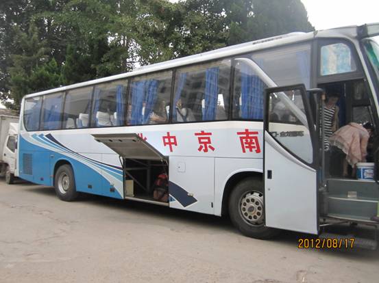 日照距南京有八百多公里,綜合考慮了火車與汽運,最終我們選擇了途牛旅行社,包了一輛旅游巴士。考慮到學員與家屬長途旅行的舒適度,雖然28位成人與5位孩童坐一輛33座的巴士已經足夠,但學院還是定了一輛45座的大型巴士。然而,8月16日清晨六點,當大家睡眼惺忪拖著行李來到電大時,卻傻了眼——旅游公司從行程的性價比出發(fā),自作主張的派出一輛33座的巴士。經過多方協(xié)調,打了N通電話之后,我們終于在中央門汽車客運中心換了一輛寬敞、潔凈的45座巴士。