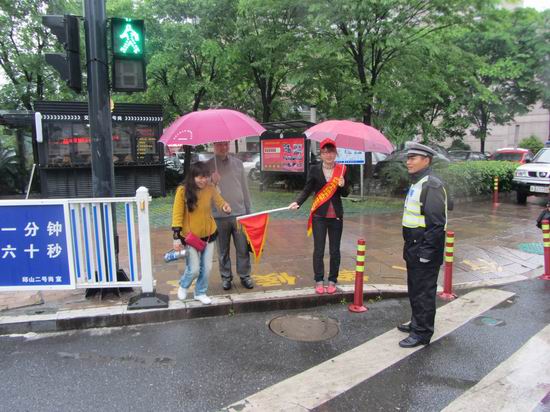 雖然天氣不是很好,但是志愿者們依然頂著風冒著雨堅守在自己的崗位上,一絲不茍地工作著。他們手舉小紅旗,勸導原本習慣在路當中等紅燈的路人,退到行人等候區(qū)等候,紅燈變綠燈時,引導大家往正確的方向走;他們友善地勸導闖紅燈的行人下次過馬路時要遵守交規(guī)則;他們還主動幫助需要的行人撐起雨傘。風雨中,這些遠程大學生和交警一起,為人們的安全出行盡一份心,出一份力。而溫暖著他們的是行人的理解與關懷:“不好意思,下次再不這樣了。”“天冷,要多穿點哦”。