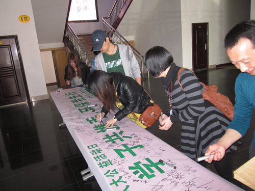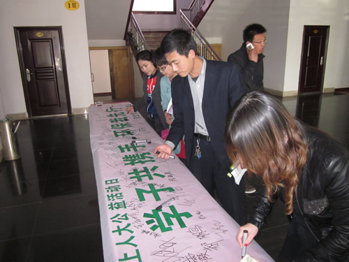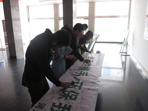 2013年4月14日下午,河北電大教學(xué)服務(wù)中心組織了以“學(xué)子共攜手,環(huán)保我先行”為主題的公益簽名活動(dòng)。活動(dòng)在北校區(qū)一樓大廳舉行,網(wǎng)上人大的學(xué)員們參與積極性很高,還有一些學(xué)員還帶著孩子一同來參加。整個(gè)簽名現(xiàn)場氣氛熱烈,共有百余人在宣傳橫幅上簽名?;顒?dòng)通過展板展示、發(fā)放宣傳資料等多種形式宣傳環(huán)保知識,倡議大家從身邊小事做起,共建節(jié)約型社會(huì),積極倡導(dǎo)廣大學(xué)員大力宣環(huán)境保護(hù)知識、增強(qiáng)環(huán)保意識,同時(shí)呼吁社會(huì)各界珍惜生態(tài)環(huán)境、保護(hù)生態(tài)環(huán)境,為保護(hù)環(huán)境做出自己力所能及的貢獻(xiàn)?! ?/p>
