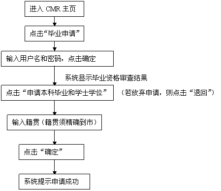 - 符合畢業(yè)條件的學(xué)生須在2010年2月8日9:00至3月3日中午12:00之前在網(wǎng)上提交畢業(yè)申請。首先點(diǎn)擊CMR主頁左上角的“學(xué)員通道”中的“畢業(yè)申請”,鍵入用戶名和密碼后,系統(tǒng)自動進(jìn)行畢業(yè)資格審查,并顯示審查結(jié)果?,F(xiàn)以符合畢業(yè)和學(xué)位申請條件的學(xué)生為例來詳細(xì)說明畢業(yè)申請流程: