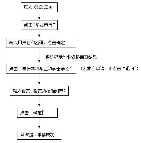 - 符合畢業(yè)條件的學(xué)生須在3月2日中午12:00之前在網(wǎng)上提交畢業(yè)申請。首先點(diǎn)擊CMR主頁左上角的“學(xué)員通道”中的“畢業(yè)申請”,鍵入用戶名和密碼后,系統(tǒng)自動進(jìn)行畢業(yè)資格審查,并顯示審查結(jié)果。現(xiàn)以符合畢業(yè)和學(xué)位申請條件的學(xué)生為例來詳細(xì)說明畢業(yè)申請流程: