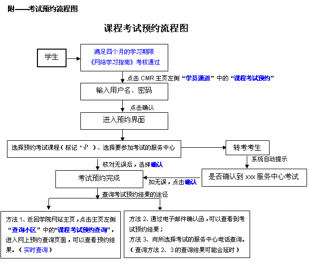 3) 考試時(shí)必須攜帶學(xué)生證和身份證參加考試,若學(xué)生證丟失或正在辦理中,則必須到所屬服務(wù)中心開具《學(xué)生身份證明》,持此證明和身份證參加考試。具體辦理辦法可向所屬服務(wù)中心咨詢。 - 預(yù)約流程 (附:課程考試預(yù)約流程圖)