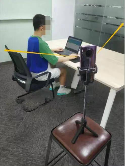 2.統(tǒng)考雙機(jī)位考試需配備一部智能手機(jī)微信掃碼運(yùn)行鷹眼程序監(jiān)控考試過(guò)程,建議使用三腳架固定手機(jī),監(jiān)控手機(jī)擺放于考生側(cè)后方45度角左右位置,距離考生1.5-2米左右,確保能清晰照攝考生桌面、雙手以及電腦屏幕,否則考試成績(jī)無(wú)效。