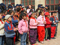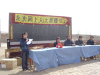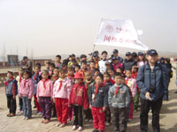 青邊口村近了,進村的路已經(jīng)非常平整,路兩旁還種上了白楊,雖然還不是滿眼的綠色,但是已經(jīng)讓我們感受到了勃勃生機。很快就看見了廷元希望小學操場上飄揚的五星紅旗,為了迎接我們的到來,學校的師生還特地在校門口插上了彩旗,迎風飄揚,很是醒目。車停在村口,大家排好隊走進小學,孩子們已經(jīng)站得整整齊齊等待我們的到來,會場也貼上了標語,布置得煥然一新。