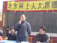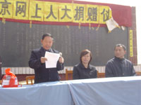 捐贈儀式開始了,院長助理何理博代表網(wǎng)上人大講話,他說,我是第二次來到這里參加這個活動了,看見青邊口村的生活一天天好起來,我也非常高興。這次我們帶來了一些禮物送給孩子們,希望能夠幫助你們實現(xiàn)自己的夢想,也希望你們能夠好好學習,茁壯成長,長大了,為改善家鄉(xiāng)的面貌出一份力。然后,網(wǎng)上人大學生代表和廷元希望小學校長分別發(fā)言,學生代表鄭宇表達了同學們對孩子們的關注,并鼓勵他們即使在艱苦的環(huán)境中,也要刻苦學習,爭取成為對家鄉(xiāng)建設有用的人;而廷元希望小學的校長則一再對網(wǎng)上人大堅持了六年的捐助活動表示深切的謝意。儀式最后,網(wǎng)上人大部分領導代表學院將為孩子們準備的圖書、玩具和各類辦公及學習用品送到了廷元希望小學校長的手中。