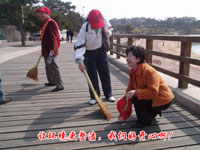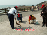 “美化青島,綠化青島,凈化青島”,這樣的標(biāo)語(yǔ)隨處可見,青島是 2008 年北京奧運(yùn)會(huì)的唯一伙伴城市,我們要用自己的雙手使青島要更加的干凈、美麗。早上 9 點(diǎn)我們高舉人大網(wǎng)院的大旗,乘坐服務(wù)中心的大巴車來(lái)到了海邊,同學(xué)們一下車就緊張的忙碌起來(lái),用掃帚和簸萁開始清理塑料袋、紙屑、食品袋等廢物,由于風(fēng)比較大,清潔起來(lái)比較難,同學(xué)們忙得都出了汗。在木棧道上,仔細(xì)一看,吃完了的口香糖粘在木棧道上,時(shí)間長(zhǎng)了,黑乎乎的,非常難看,同學(xué)們就蹲在地上用小鏟子一塊一塊的刮掉。我們的行動(dòng),也感染了周圍的人,一位剛剛吃完雪糕的中學(xué)生把雪糕盒從海邊越過(guò)沙灘放在了垃圾桶里;還有一個(gè)小朋友,把自己吃完了的口香糖用手紙包好給了我們的拿垃圾袋的同學(xué)。說(shuō):“姐姐,我要向你們學(xué)習(xí),也要講衛(wèi)生、講文明!蔽覀兌紩(huì)心的笑了。